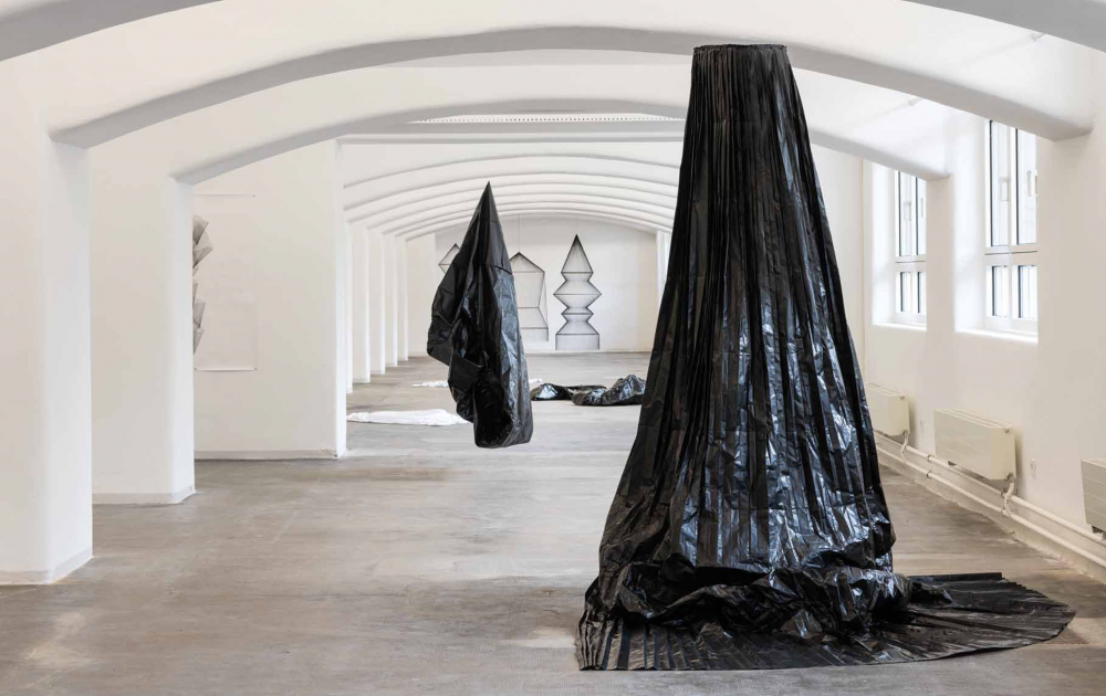 Ihre filigranen Strichzeichnungen erinnern an abstrakte Bänder, die durch einen virtuellen Raum wirbeln, gefaltete und genähte Objekte aus Kohle- oder Fotopapier bilden bizarre, fragile und teils voluminöse Körper, die am Boden kauern oder von der Decke hängen und im leisesten Luftzug zu schwanken beginnen. Im Werk von Constanze Vogt (geb. 1984), 17. Stipendiatin der HAP-Grieshaber-Stiftung, steht die Transformation von Linien oder Flächen in die Dreidimensionalität im Fokus. Dabei untersucht die Künstlerin die Reaktion von Material auf fremde Werkprozesse und zeigt, wie die Objekte ihre Materialästhetik darin vollkommen verändern.